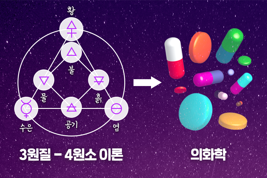 여기서 당대 물질에 관한 설명의 주류였던 4원소설을 기존과는 다른 시각으로 보다 유용하게 활용하고자 하는 사람들이 등장하기 시작했습니다. 이들은 4원소로 대표되는 물질들을 교묘하게 조합하면 모든 물질을 만들어낼 수 있다고 여겼습니다. 그들의 믿음이 ‘연금술’이라는 이름의 독자적인 하나의 연구 영역으로 자리잡게 된 데는 그리 오랜 시간이 걸리지 않았습니다.
