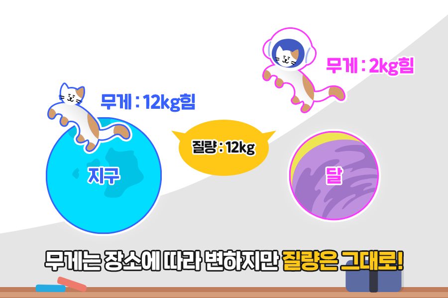 예를 들어 지구에서 무게가 12kg힘인 고양이가 달에 간다면, 무게는 2kg힘이 됩니다. 이는 지구에서 작용하는 중력과 달에서 작용하는 중력이 다르기 때문이죠. 하지만 지구에서나 달에서나 이 고양이의 질량은 12kg으로 같습니다.