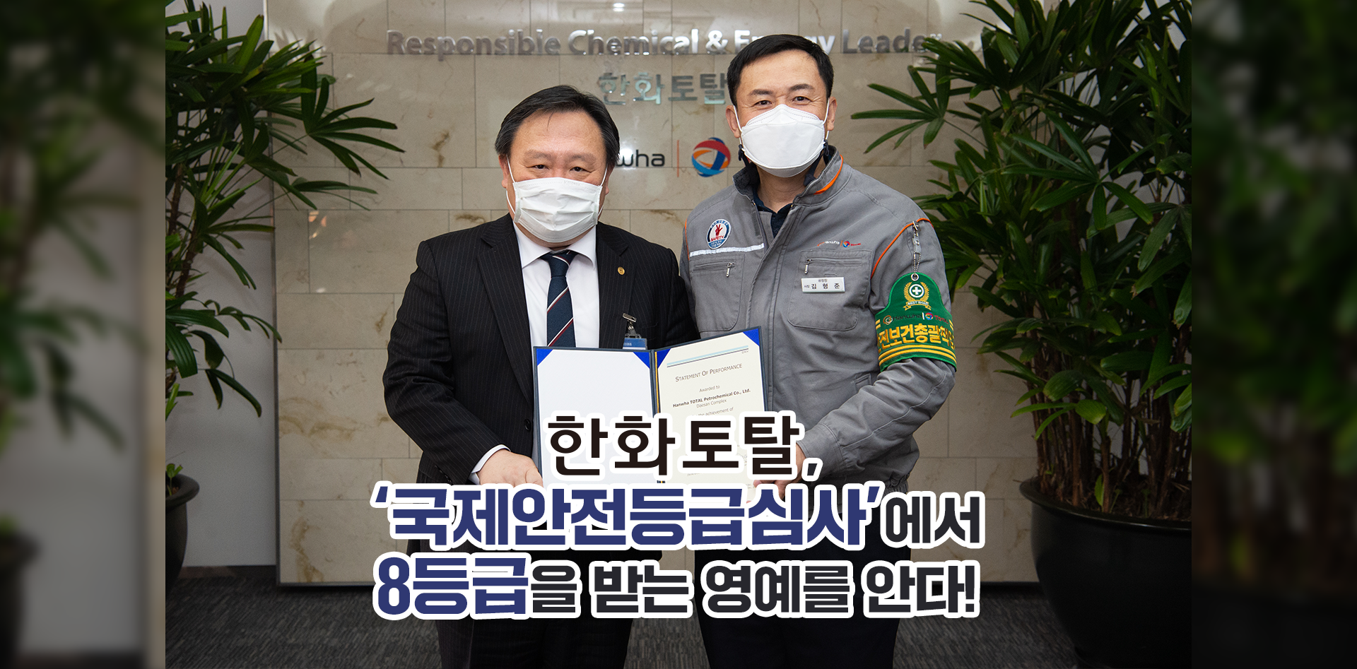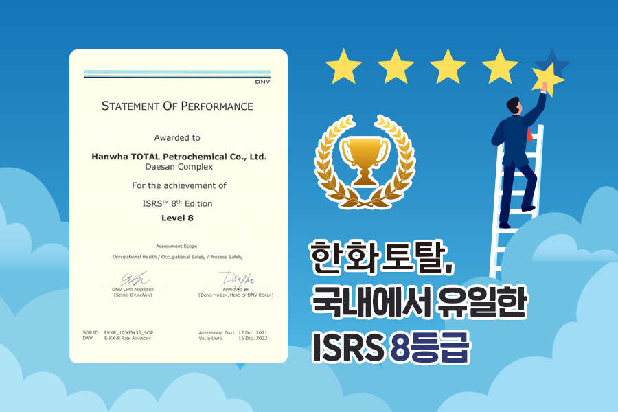 국내에서 유일한 ISRS 8등급을 얻은 한화토탈! 담당 임직원들이 이뤄낸 놀라운 성과에 어깨가 절로 으쓱해지는데요. 앞으로도 한화토탈은 초심을 잃지 않고 대한민국을 넘어 전 세계의 안전문화를 선도해 나가는 사업장이 되기 위해 노력해 나가겠습니다. 한화토탈의 활약 많이 기대해 주세요!
