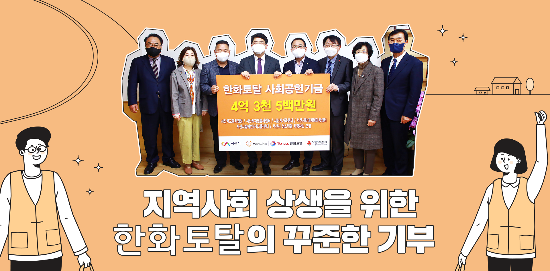 ‘함께 멀리’라는 철학을 바탕으로 지역사회에 실질적으로 도움이 되고, 함께 성장하는 것을 목표로 하는 한화토탈은 올해에도 서산 지역사회에 대규모 사회공헌기금을 기부했습니다. 오늘은 따뜻한 봄바람을 타고 들려온 한화토탈의 훈훈한 소식을 들려드리겠습니다.