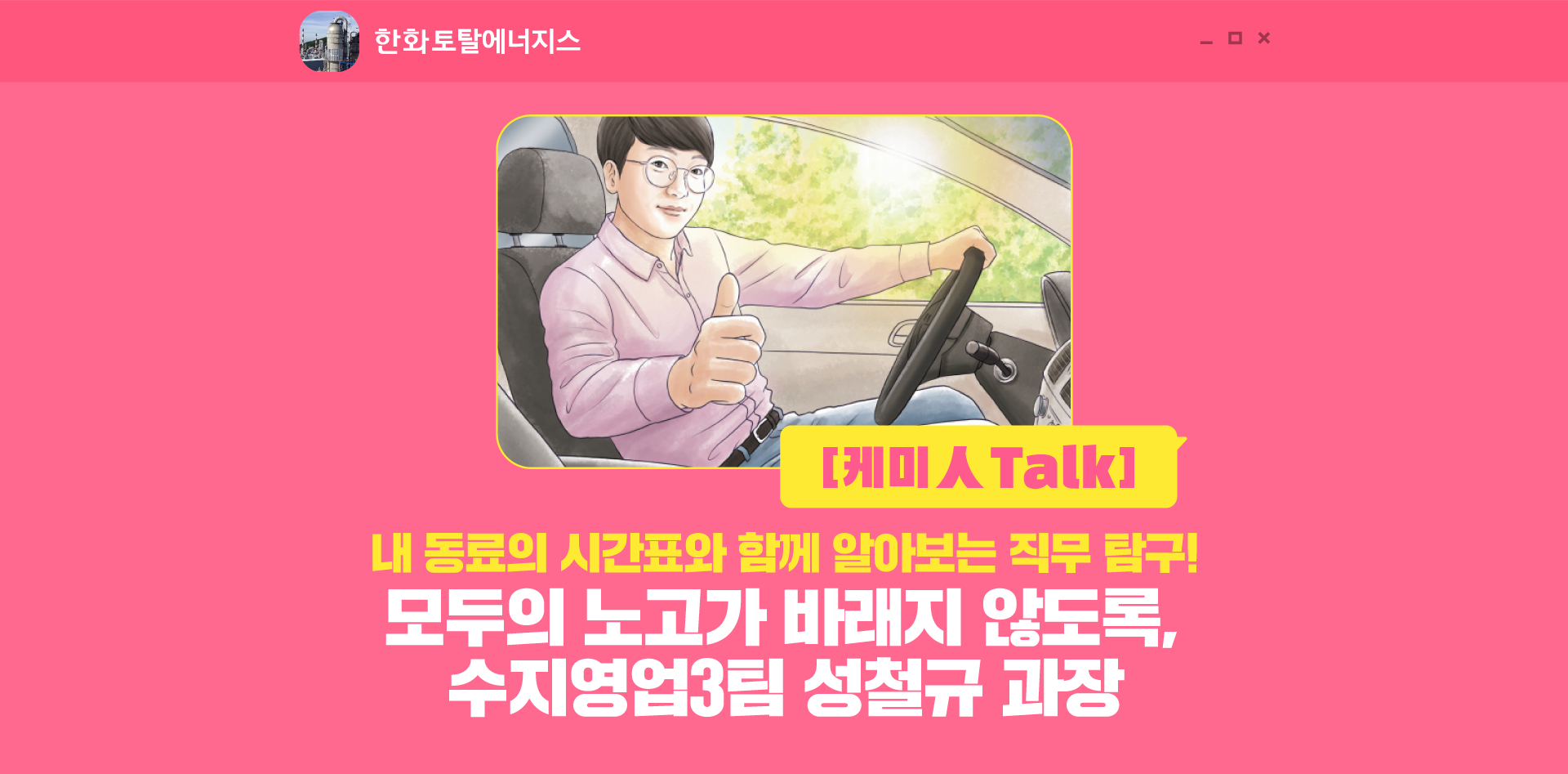 오늘은 구매와 생산, 연구, 물류 등 모든 부서의 노력이 바래지 않도록 최선을 다하는 수지영업3팀의 성철규 과장을 만나보았는데요! 성철규 과장의 일과표과 인터뷰를 통해 수지영업3팀의 업무를 면밀히 알아보았습니다. 다음 케미人Talk에서는 어떤 부서의 업무가 소개될까요? 많이 기대해 주세요!