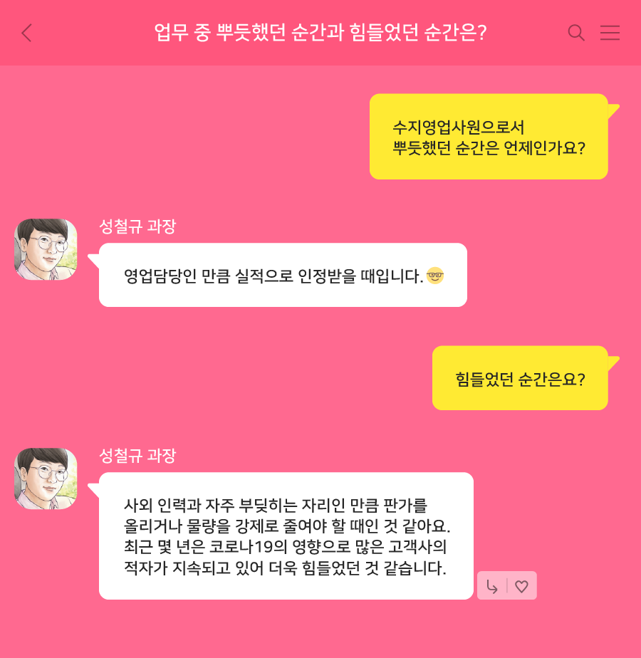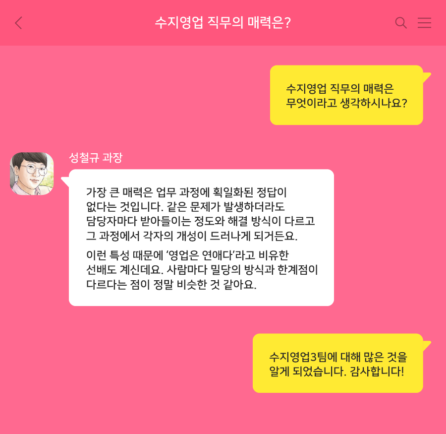이런 특성 때문에 ‘영업은 연애다’라고 비유한 선배도 계신데요. 사람마다 밀당의 방식과 한계점이 다르다는 점이 정말 비슷한 것 같아요.