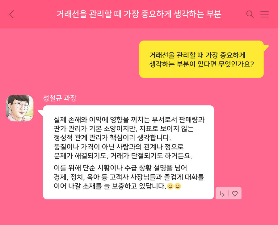 거래선 사장님들의 연배 탓도 있지만, DT(Digital Transformation·디지털 전환)가 가속화되는 시대에서 바로 이 부분이 영업 인력의 존재 의의라고 생각합니다. 품질이나 가격이 아닌 사람과의 관계나 정으로 문제가 해결되기도, 거래가 단절되기도 하거든요. 신뢰와 친밀감을 쌓는 과정은 어렵지만, 핵심은 ‘내가 이 사람의 시간을 뺏는 것 이상의 메리트를 얼마나 줄 수 있나’인 것 같습니다. 이를 위해 단순 시황이나 수급 상황 설명을 넘어 경제, 정치, 육아 등 고객사 사장님들과 즐겁게 대화를 이어 나갈 소재를 늘 보충하고 있답니다.