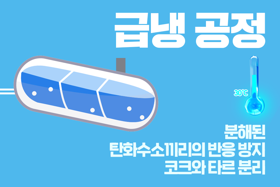 급냉 공정은 분해된 탄화수소끼리 서로 반응하지 못하도록 막을 뿐만 아니라 열분해 가스 내에 뒤섞여 있는 코크와 타르를 분리합니다. 이는 다음 공정인 압축 공정에서 압축 설비가 오염되는 일을 막고, 흡입온도를 낮춰 부하를 줄이는 데 큰 도움을 준답니다.