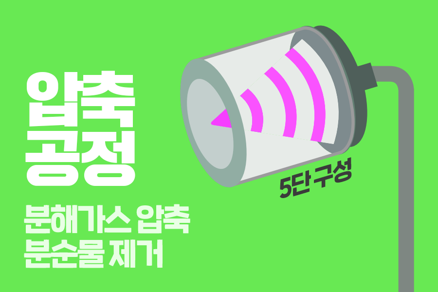 압축 공정은 경제성을 높이기 위해 분해 가스를 압축하여 부피를 줄이는 과정입니다. 더불어 이 과정에서는 열분해 공정에서 설비를 보호할 목적으로 주입한 산성 가스와 촉매의 독성 물질 역시 제거합니다.