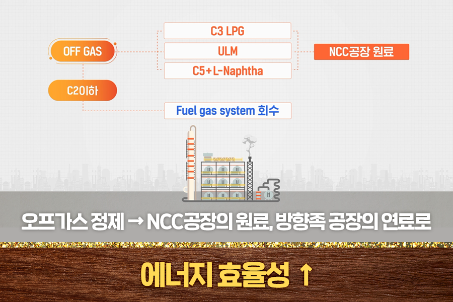 즉, 오프가스를 NCC 공장의 원료와 방향족 공장의 연료로 사용할 수 있도록 정제하여 에너지 효율성을 높이는 것입니다. 이는 기존 NCC 공장의 원료 및 잉여 오프가스 연소에 들었던 비용을 절감하는 데도 도움을 줍니다.