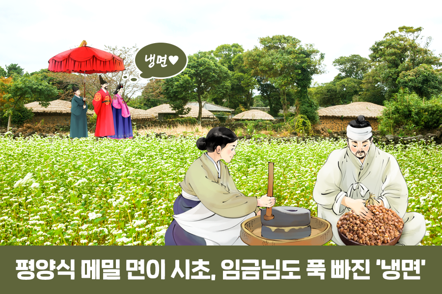 냉면은 언제 처음 먹게 된 음식일까요? 본래 냉면이라 함은 메밀로 면을 만들어 차갑게 먹는 국수를 의미했습니다. 북한의 연구에 따르면 냉면의 기원은 고려시대로 거슬러 올라갑니다. 평양에 살던 주막집 부부가 우연히 100세 노인에게서 장수 비결이 ‘메밀’이라는 말을 들은 후 메밀로 면을 뽑아 동치미국물에 말아먹었는데 맛이 일품이었다고 합니다. 이후 이들 부부가 만든 음식이 맛있기로 소문이 나, 메밀로 만들어 차가운 육수에 말아먹는 냉면이 유명해졌다고 하네요.