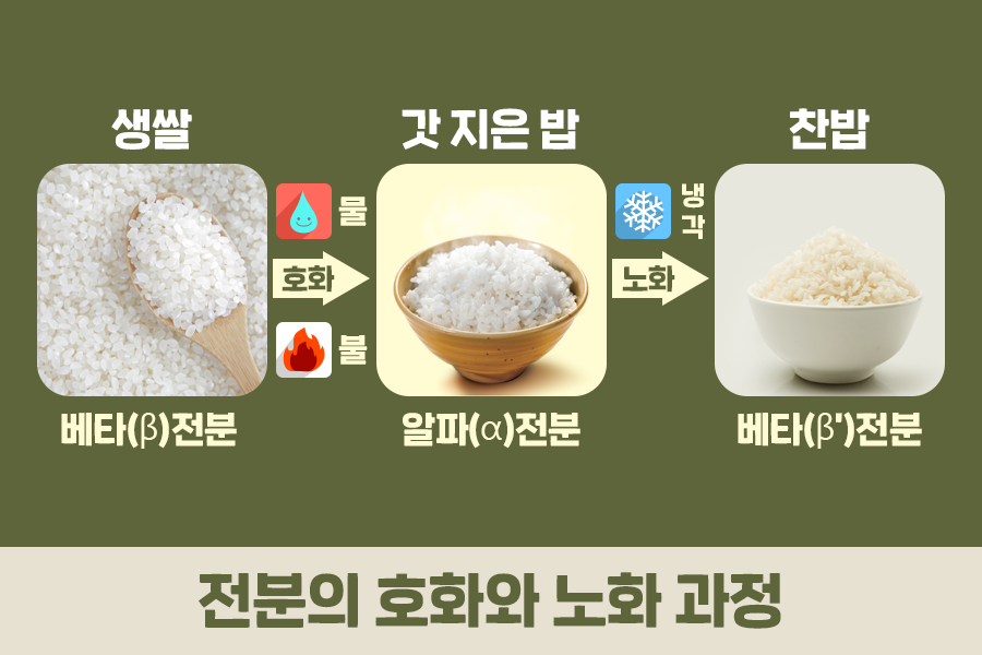 찬밥을 라면 국물에 말았을 때 더 맛있게 느껴지는 것도 노화과정과 연관이 있습니다. 수분이 빠져나간 베타전분 상태의 찬밥이 이미 수분을 충분히 머금고 있는 알파전분 상태의 따뜻한 밥에 비해 국물을 빨리, 많이 흡수하기 때문에 라면국물이 밥알에 잘 스며드는 것이죠. 전분의 호화와 노화는 우리의 식생활 곳곳에서 찾아볼 수 있습니다.