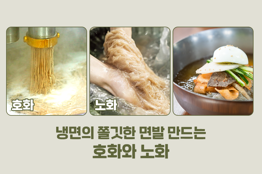 냉면 면을 뽑는 과정을 살펴보면 먼저 제면기에서 나온 면발이 곧바로 뜨거운 물로 들어갑니다. 이때 호화가 진행되는데요, 전분이 뜨거운 열과 수분을 만나 팽창되어 점착력과 부피가 증가하게 되는데, 일정 시간 동안 면을 삶아 호화 과정을 거칩니다.
