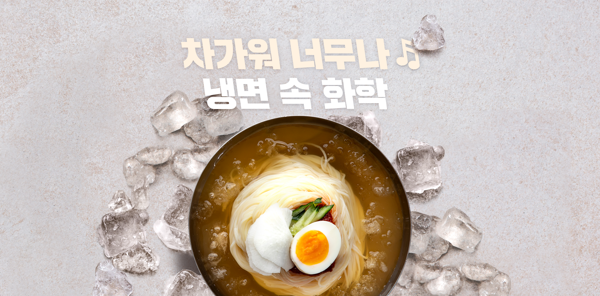 오늘은 이렇게 한 그릇의 냉면과 관련한 화학 이야기를 알아 보았습니다. 화학 원리를 자연스럽게 터득한 선조들의 생활 속 지혜가 전해져 내려오고 있는데요. 원리를 알고 나니 냉면 한 그릇이 더욱 소중하게 느껴지네요. 그런데 글 읽는 내내 냉면의 유혹, 참기 힘드셨죠? 오늘의 메뉴는 땀방울 식혀줄 시원한 냉면 한 그릇 어떠실까요? 쫄깃한 면발 한 젓가락에 호화 과정, 차디찬 국물 한 모금에 노화 과정을 생각해주세요!
