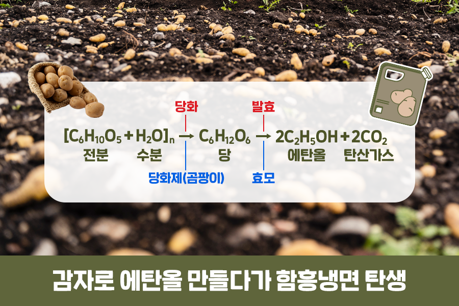 여기서 잠깐! 감자로 에탄올을 만드는 과정에 대해 알아보겠습니다. 이는 곡식으로 술을 담그는 것과 비슷한 과정을 거치는데요, 크게 전분의 당화과정과 효모의 발효과정이라는 두 가지 단계를 거칩니다. 감자 전분에 물과 당화효소인 곰팡이를 넣으면 미생물이 다당류인 전분을 단당류인 포도당으로 당화*시킵니다. 그리고는 발효 과정에 관여하는 미생물인 효모를 넣어주면 미생물이 단순당을 에탄올로 전환시킨답니다.