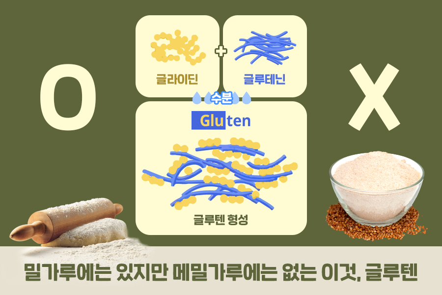 오늘날 우리가 흔히 먹는 냉면은 보통 60~80%의 메밀과 밀가루를 섞어서 만듭니다. ‘글루텐’이라는 성분 때문인데요. 글루텐이란 물에 녹지 않는 불용성 단백질로 이름의 Glu에서 유추할 수 있듯이 점착성을 갖습니다. 밀가루에는 글루텐이 있지만 메밀에는 글루텐이 없는데요. 이 때문에 메밀가루만으로는 끈기가 없어 반죽을 뭉치거나 면으로 뽑아내는 게 어렵지요. 그래서 밀가루를 함께 섞어서 만드는 것입니다.