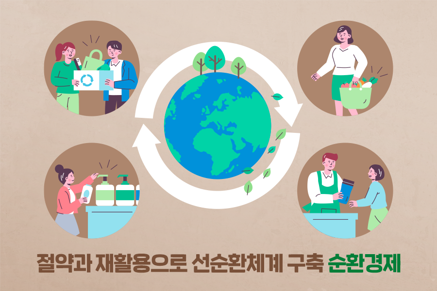 최근 ‘순환경제’라는 말을 들어보셨나요? 앞서 알아본 문제의 해결책으로 ‘순환경제’가 언급되고 있습니다. 순환경제는 자원의 절약과 재활용을 통해 지속 가능성을 추구하는 친환경 경제 모델을 일컫습니다. 이는 자원을 채굴해 상품을 생산하고, 소비한 후에 폐기하는 기존의 선형경제와 대비되는 개념이죠. 순환경제는 자원 부족 같은 문제가 심화되는 악순환을 막기 위해, 폐기물을 최소화하고 이를 최대한 재활용하는 선순환체계를 구축하는 일이랍니다.