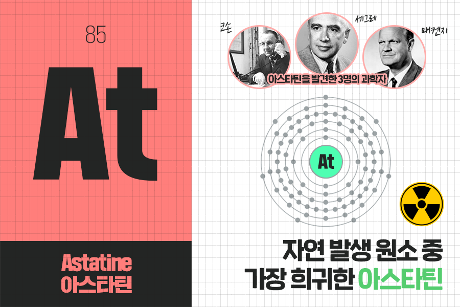 최대 8시간의 짧은 반감기*를 갖고 있기 때문에 ‘불안정’을 뜻하는 그리스어, ‘astatos’에서 이름이 유래된 아스타틴은 1940년 미국 버클리에 있는 캘리포니아대학교에서 세 명의 물리학자가 핵반응을 통한 합성을 통해 처음 발견했습니다.