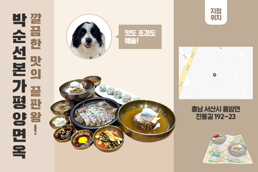 주변 경치와 함께 맛있고 깔끔한 냉면, 그리고 다양한 메뉴를 전부 즐기고 싶으시다면 박순선본가평양면옥을 적극적으로 추천합니다. 식당 옆에는 손님 맞이에 바쁜 귀여운 강아지와 요리조리 분주히 움직이는 닭들도 있답니다.