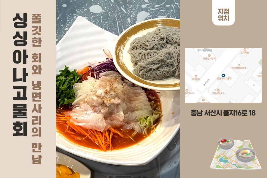 싱싱아나고물회에서 물회를 시키면 냉면 사리가 함께 나옵니다. 새콤달콤, 매콤하고 시원한 물회 육수에 쫄깃한 회, 거기에 탱글탱글한 냉면 면발과 아삭아삭한 채소들을 한입 가득 먹으면 입 안에서 축제가 열린 듯합니다.