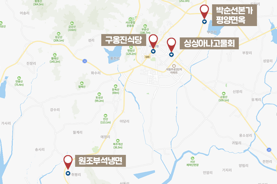 조그마한 시골 마을, 입구에 들어서자마자 북적북적한 이곳은 바로 첫 번째로 소개해 드릴냉면 맛집, 원조부석냉면입니다. 건물 밖에 걸려있는 간판에는 냉면만 허유~라고 적혀져 있는데요. 그도 그럴 것이 메뉴가 물냉면과 비빔냉면, 딱 두 가지로 구성되어 있습니다.