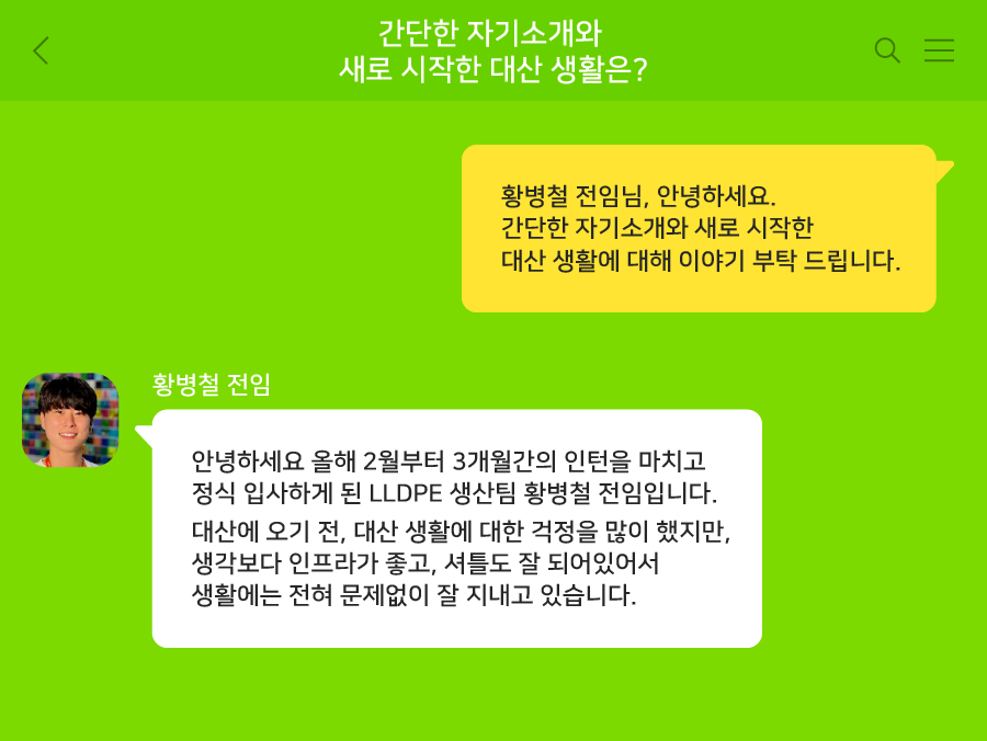 안녕하세요? 올해 2월부터 3개월간의 인턴을 마치고 정식 입사하게 된 LLDPE 생산팀 황병철 전임입니다.