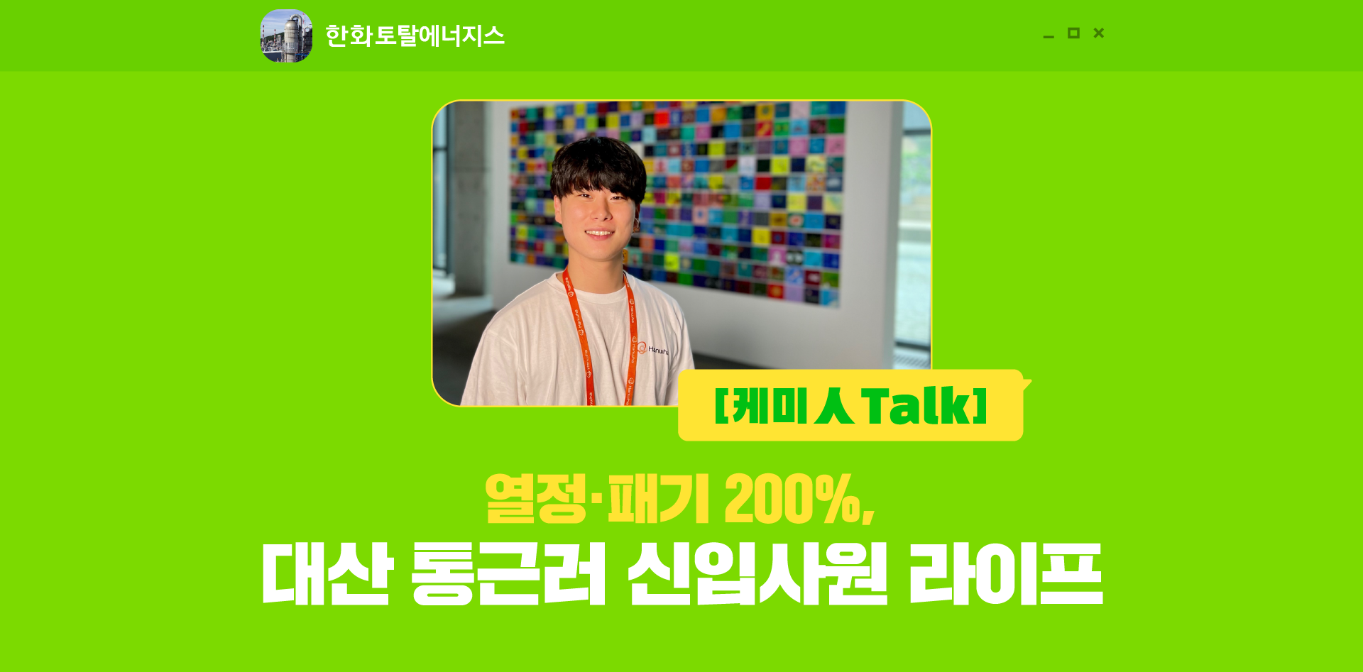 하나, 둘, 셋, 야! 천방지축 어리둥절 빙글빙글 돌아가는 신입사원의 하루! 오늘은 한화토탈에너지스에서 인턴생활을 마치고 신입사원으로 새로운 걸음을 시작한, 황병철 전임의 대산 생활에 관해 들어보도록 하겠습니다!