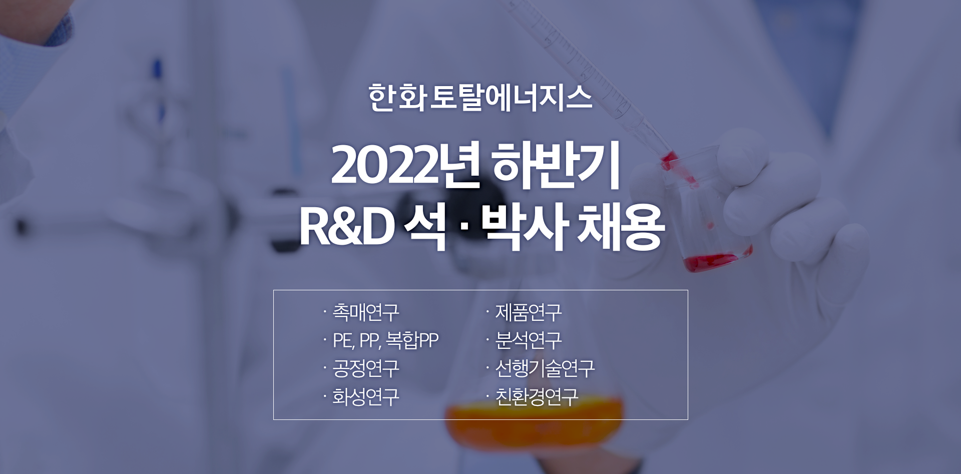 한화토탈에너지스가 2022년 하반기 R&D 석·박사를 채용하고 있습니다. 공식 공고 및 접수는 한화인 사이트에서 2022년 9월 30일 15:00시까지 진행될 예정입니다.