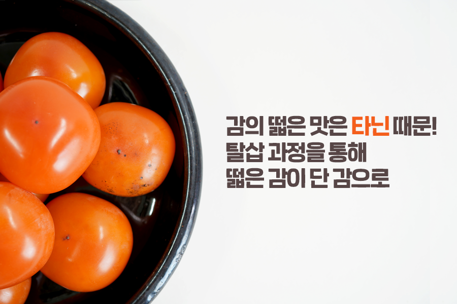설익은 감을 먹으면 입안이 텁텁하고, 떫은맛이 나죠. 감이 떫은맛을 내는 이유는 바로 페놀 화합물인 타닌(Tannin)때문입니다. 타닌은 물에 녹는다는 특징이 있는데요. 감 속에 함유된 타닌이 과즙에 녹아 나오면서 떫은맛을 내는 것입니다.