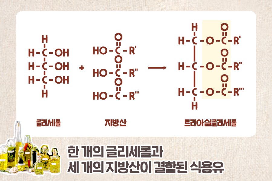 전을 부치기 위해서는 꼭 필요한 것이 있는데요, 바로 음식이 팬에 들러붙지 않게끔 도와주는 식용유입니다. 식용유는 한 개의 글리세롤(Glycerol)과 세 개의 지방산(Fatty Acid)이 결합된 구조로 트리아실글리세롤(Triacylglycerol)이라고 알려진 분자입니다.