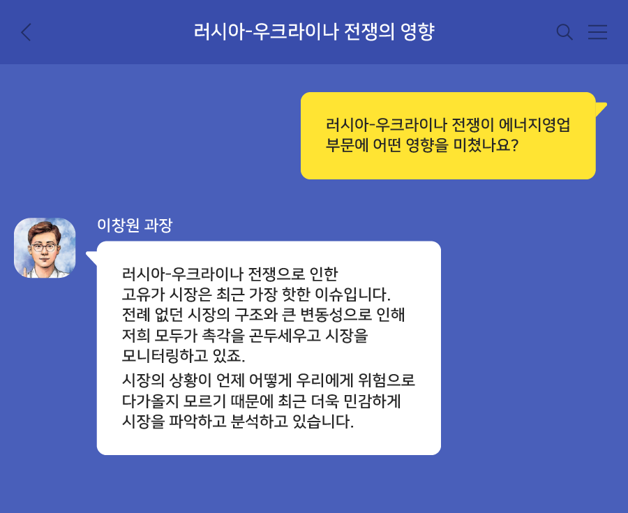 러시아-우크라이나 전쟁으로 인한 고유가 시장은 최근 가장 핫한 이슈인 것 같습니다. 전례 없던 시장의 구조와 큰 변동성으로 인해 저희 사업 부문 인원 모두가 촉각을 곤두세운 채 시장을 모니터링하고 있죠.