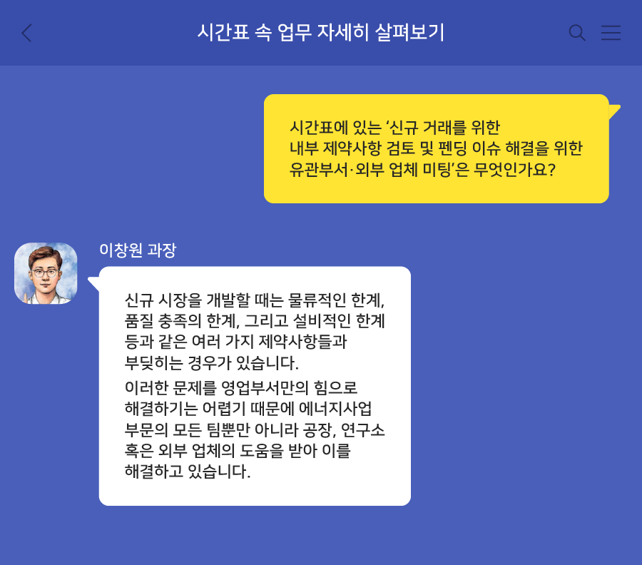 이렇게 마주한 문제들을 어떻게 해결해 나가느냐에 따라 해당 사업의 추진 여부와 경쟁력이 판가름 나기도 하죠. 하지만 이러한 문제를 영업부서만의 힘으로 해결하기는 참 어렵습니다. 따라서 에너지사업 부문의 모든 팀뿐만 아니라 공장, 연구소 혹은 외부 업체의 도움을 받아 이를 해결하고 있습니다.