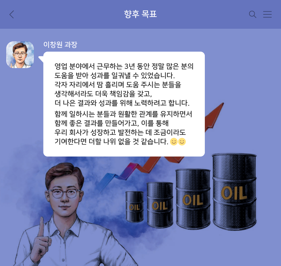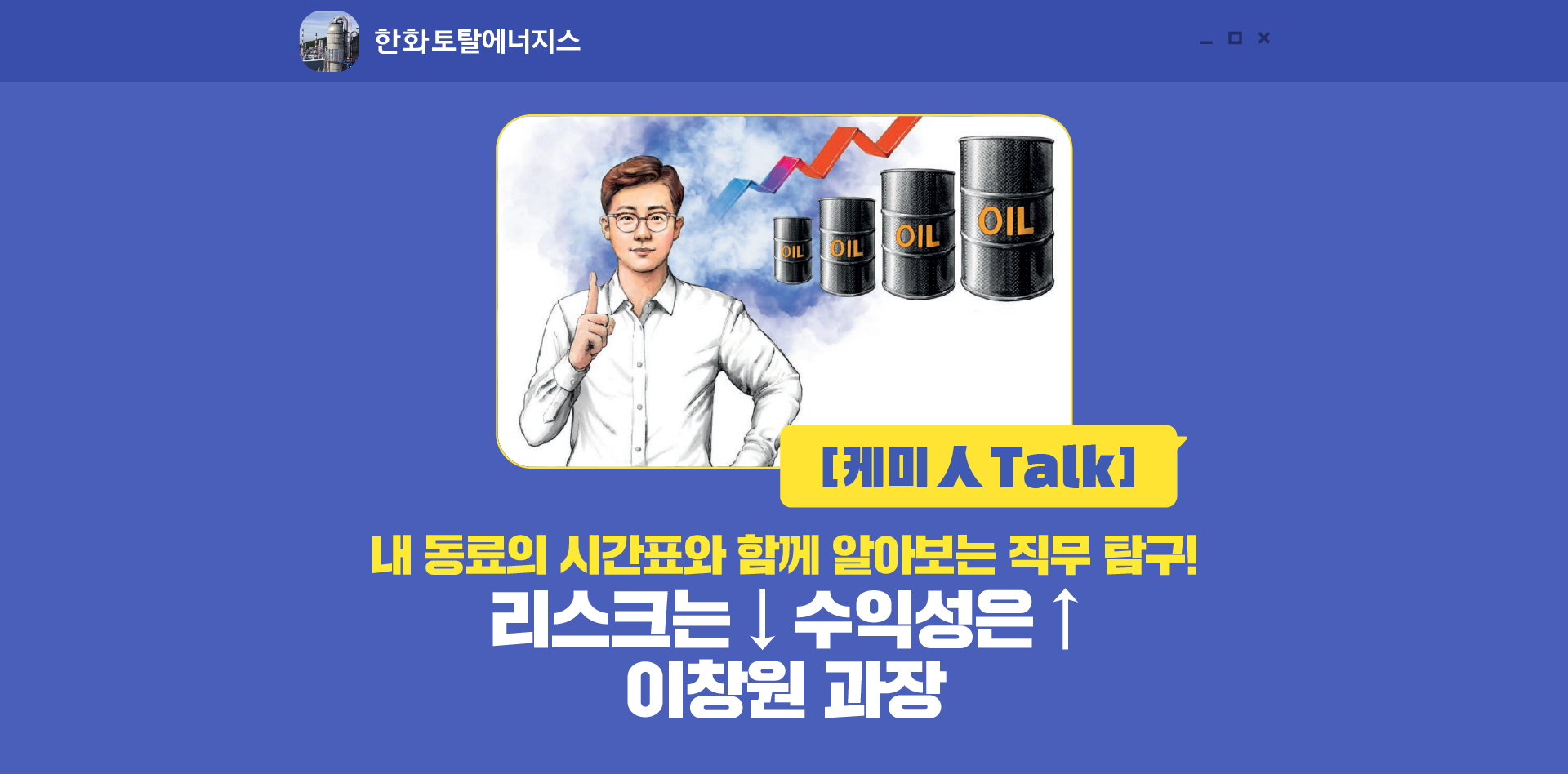오늘은 한화토탈에너지스의 성장과 발전을 위해 매일 힘써 나아가는 에너지영업3팀의 이창원 과장의 하루를 통해 에너지영업3팀의 업무를 살펴볼 수 있었는데요. 다음에는 어떤 부서의 일과가 기다리고 있을까요? 그럼, 다음 이 시간까지 안녕~