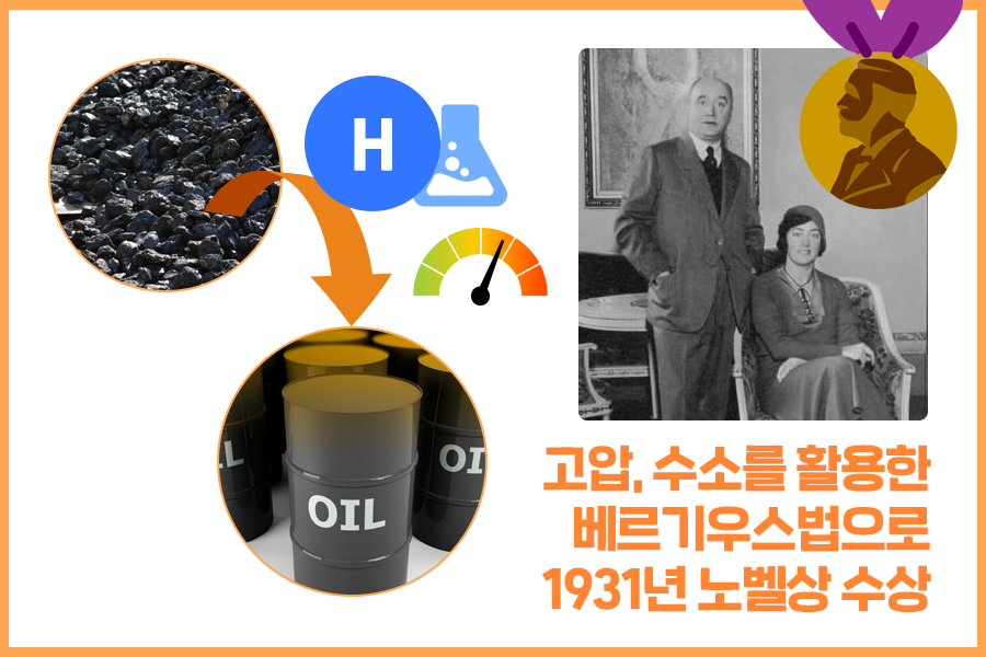 베르기우스는 증류가 일어나는 동시에 수소를 고압으로 밀어 넣어 더 많은 수소가 석탄과 화학적으로 결합하게 했습니다. 또한 열을 더욱 고르게 분산시키고 정확한 온도 조절을 위해 가루로 만든 석탄을 오일과 섞어서 고압의 수소로 처리하는 방식을 고안해냈습니다.