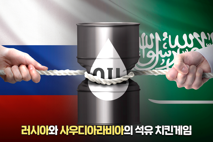 미국의 셰일 혁명 이후 원유 생산량이 증가하면서 유가가 하락하자, 주요 원유 생산국인 사우디아라비아는 큰 위기에 봉착했습니다. 이에 사우디는 유가를 종전 수준으로 돌려놓기 위해 다른 주요 산유국인 러시아와 감산 합의를 시도합니다. 그러나 곧 러시아의 거부로 실패로 돌아가고 말았습니다. 맞불을 놓기로 한 사우디는 원유의 생산량을 크게 늘려 유가 하락을 유도했고, 러시아가 이에 응수하면서 전 세계적인 유가 폭락으로 이어지게 됩니다.
