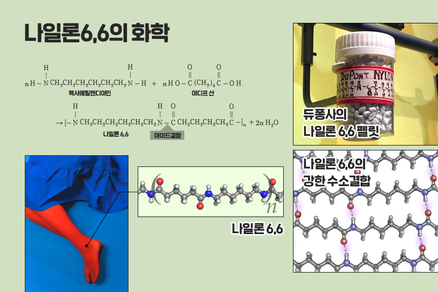 석탄, 물과 공기처럼 흔한 원료로부터 얻었지만, 나일론은 강철처럼 강하고 거미줄처럼 가늘며,