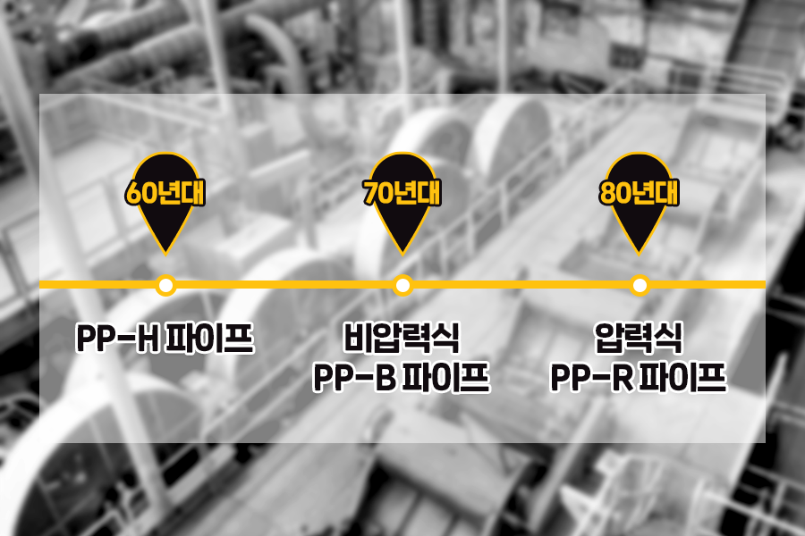 파이프의 용도로 PP 재료가 소개된 것은 60년대에 PP-H(Homopolymer) 제품이 처음입니다. 그 이후, 70년대에는 하수관 용도로 사용된 비압력식 PP-B(Block) 파이프가 등장했고, 80년대에는 냉온수관용으로 압력식 파이프인 PP-R(Random) 파이프가 사용되었습니다.