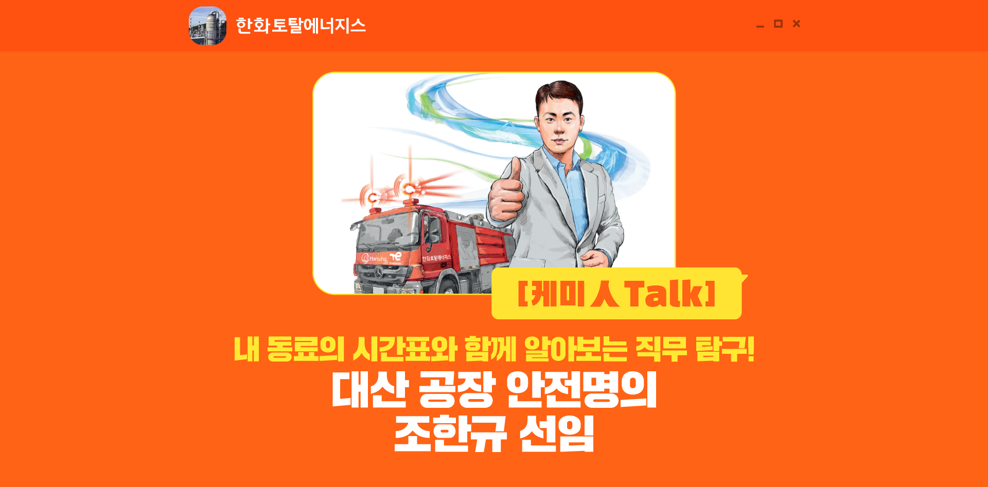 오늘은 한화토탈에너지스 대산 공장의 안전을 위해 최선을 다하는 조한규 선임의 하루를 함께 보았는데요. 오늘의 주인공 조한규 선임과 더불어 한화토탈에너지스 모두의 무탈한 하루를 위해 열심히 노력하고 계시는 모든 임직원분들께 감사한 마음을 가지며 마무리하도록 하겠습니다. 고맙습니다.