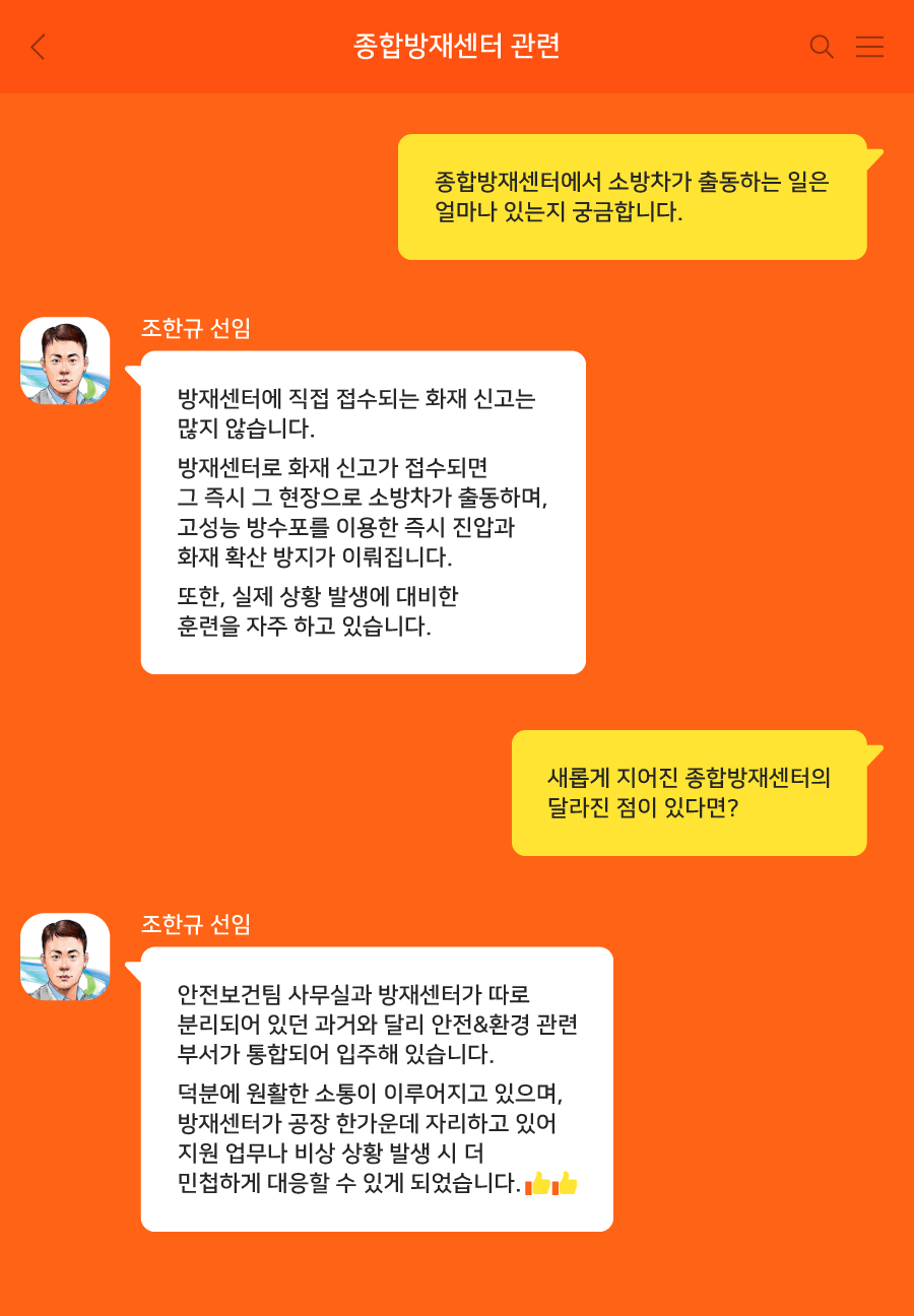 덕분에 원활한 소통이 이루어지는 것은 물론, 지원 업무 시 좀더 민첩하게 대응할 수 있게 되었다고 생각합니다. 또한, 방재센터가 공장 한가운데 자리하고 있어 비상 상황 발생 시 신속한 현장 출동과 빠른 대처가 가능하기도 합니다.