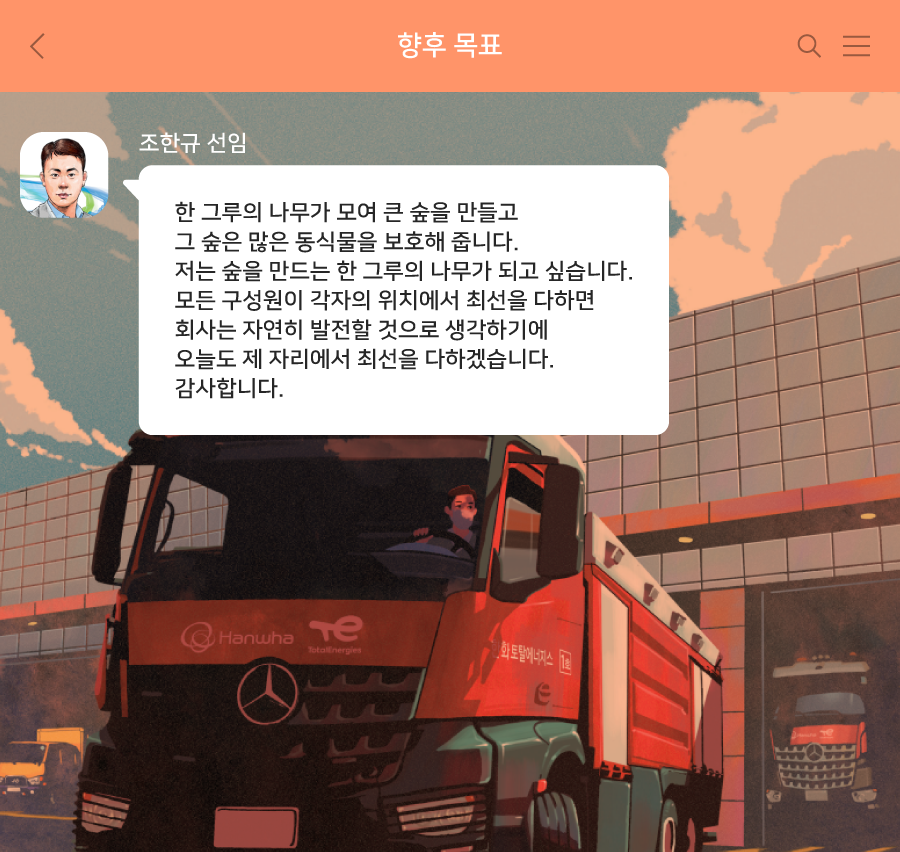 오늘은 한화토탈에너지스 대산 공장의 안전을 위해 최선을 다하는 조한규 선임의 하루를 함께 보았는데요. 오늘의 주인공 조한규 선임과 더불어 한화토탈에너지스 모두의 무탈한 하루를 위해 열심히 노력하고 계시는 모든 임직원분들께 감사한 마음을 가지며 마무리하도록 하겠습니다. 고맙습니다.