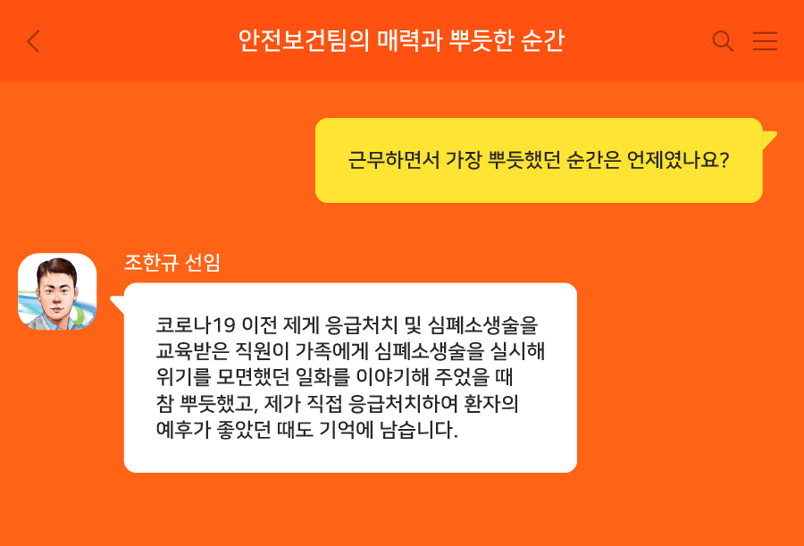 응급구조사 자격증을 갖고 있다 보니 코로나19 이전에는 각 CCR을 돌며 직원들의 눈높이에 맞춘 응급처치 및 심폐소생술 교육을 진행하곤 했습니다. 교육 이후 제게 교육받은 직원이 가족에게 심폐소생술을 실시해 위기를 모면했던 일화를 이야기해 주었을 때 제 교육이 도움을 주었다는 생각에 참 뿌듯했습니다. 물론, 제가 직접 응급처치하여 환자의 예후가 좋았던 때도 기억에 남죠.