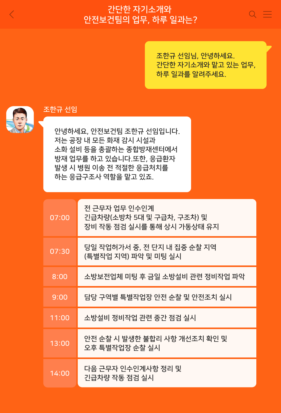안녕하세요. 안전보건팀 조한규 선임입니다. 저는 공장 내 모든 화재 감시 시설과 소화 설비 등을 총괄하는 종합방재센터에서 방재 업무와 더불어 응급구조사 역할을 맡고 있습니다.