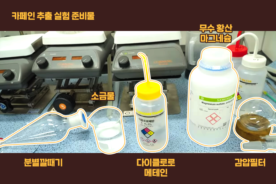 그런데 궁금합니다. 우리가 흔히 마시는 아이스 아메리카노 한 잔에는 대체 얼만큼의 카페인이 들어 있을까요? 화학에서 중요하게 사용되는 몇 가지 실험 장치들과 시약들을 이용하면 시중에서 판매되는 아이스 아메리카노 속의 카페인을 추출해볼 수 있습니다. 분별깔때기와 소금물, 유기용매인 다이클로로메테인과, 수분을 제거하기 위한 무수황산마그네슘, 그리고 감압 필터를 준비하면 됩니다. 깔때기와 소금물, 그리고 감압필터까지는 어떻게 구해볼 수 있을 것 같은데, 다이클로로메테인과 무수황산마그네슘은 일반인이 취급하기는 어려운 화학 물질입니다. 그래서 카페인을 추출하는 실험을 하기 위해서는 전문가의 도움이 필요합니다.