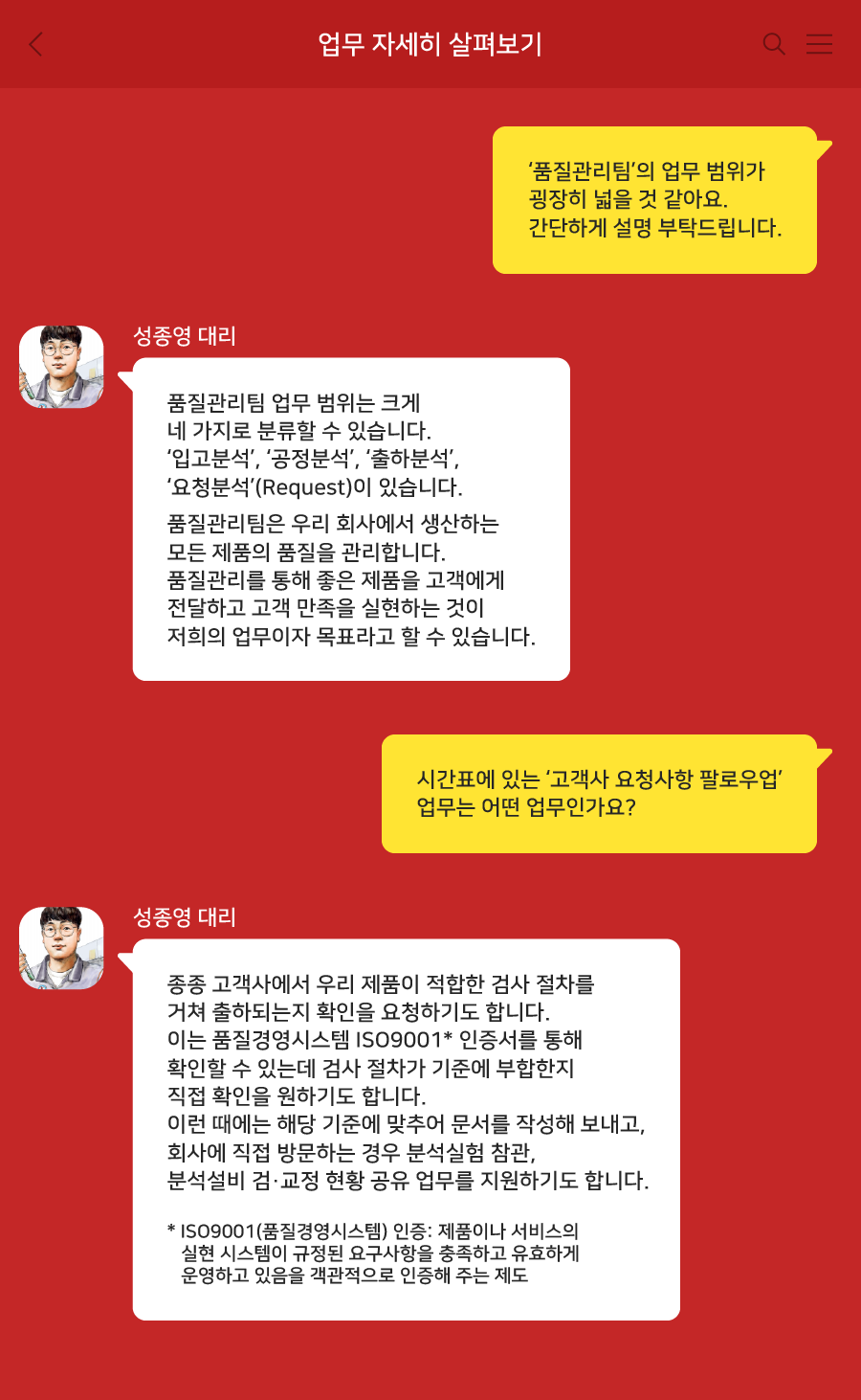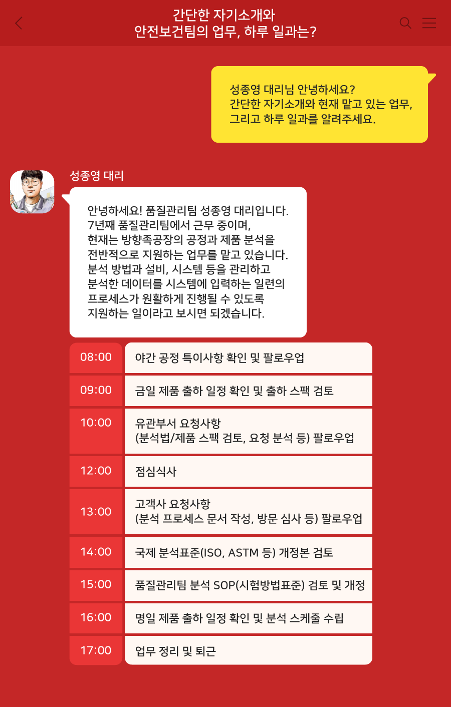 우리 회사의 고객 만족 실현에 앞장서는 품질관리팀 성종영 대리의 하루를 함께 들여다볼까요?