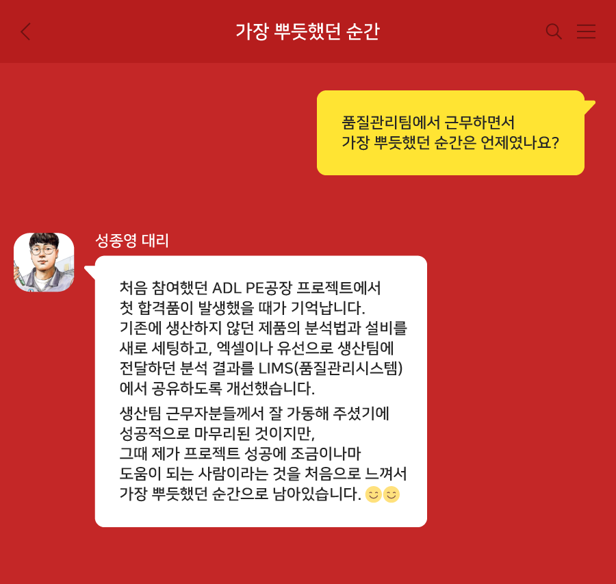 물론 제가 잘해서가 아니라 생산팀 근무자분들께서 공장을 잘 가동해 주셨기에 금방 합격품이 발생하고 프로젝트도 성공적으로 마무리될 수 있었다고 생각합니다. 하지만 그때 제가 프로젝트의 성공에 조금이나마 도움이 되는 사람이라는 것을 처음으로 느꼈고, 그래서 ADL PE공장에서의 기억은 지금까지도 제게 가장 뿌듯했던 순간으로 남아있습니다.
