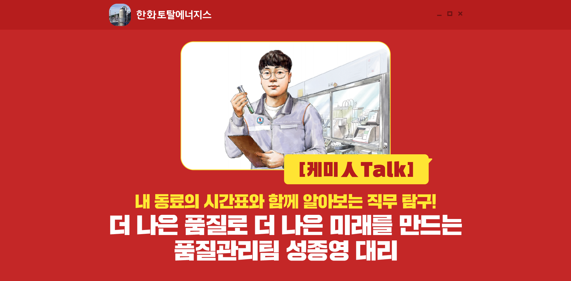 오늘은 한화토탈에너지스 제품의 더 나은 품질을 위해 끊임없이 분석하고 면밀하게 검토하는 성종영 대리의 하루를 함께 들여다보았는데요. 숫자 하나가 갖는 무게감이 결코 가볍지 않다는 책임감으로 오늘도 한화토탈에너지스의 품질 관리에 힘쓰고 있을 성종영 대리에게 격려의 박수를 보내며 마무리하겠습니다. 감사합니다!