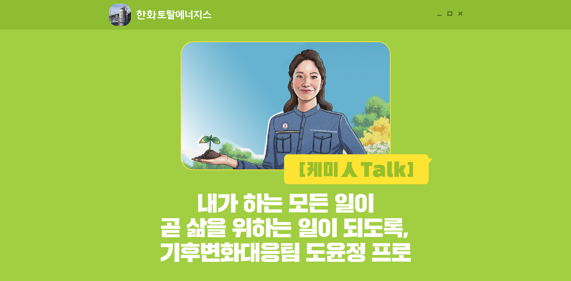 오늘은 한화토탈에너지스의 기후변화대응팀의 일원으로서 지구를 위한 더 나은 내일을 만들기 위해 노력하는 도윤정 프로의 이야기를 들어보았습니다. 도윤정 프로와 기후변화대응팀 덕분에 ‘기후위기’ 라는 위기를 딛고 ‘탄소중립’ 이라는 새로운 방향으로 나아갈 수 있는 것 같습니다. 꿀벌처럼 노력을 아끼지 않는 기후변화대응팀의 날갯짓이 아름다운 꽃을 피울 수 있기를 바라며 마치겠습니다.