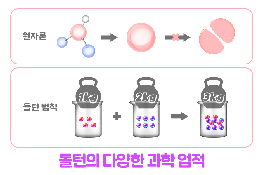 돌턴의 원자론은 근대적이며 과학적으로 증명된 최초의 원자 이론이라는 평을 받고 있습니다. 그는 물질이 원자라고 부르는, 더 이상 쪼개질 수 없는 작은 입자로 구성되어 있다고 주장했으며 화학 반응은 물질의 원자들이 자리를 옮겨 다른 조합을 만들어 내는 것이라고 말했습니다. 물론 몇 가지 가설은 틀린 부분도 있었지만, 현대 원자론의 초석을 다진 중요한 이론이라고 할 수 있습니다.