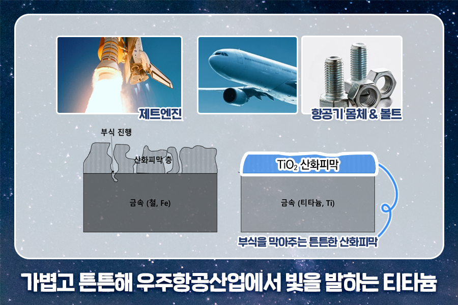 정제와 가공 비용이 비쌈에도 불구하고 티타늄의 사용처는 나날이 늘고 있습니다. 바나듐, 주석 등의 금속을 섞어 만들어지는 티타늄 합금은 철보다 튼튼하며 훨씬 가볍습니다. 또한 금속 표면의 산화 피막이 다른 금속에 비해 매우 튼튼해 다양한 환경에서도 쉽게 부식되지 않죠.