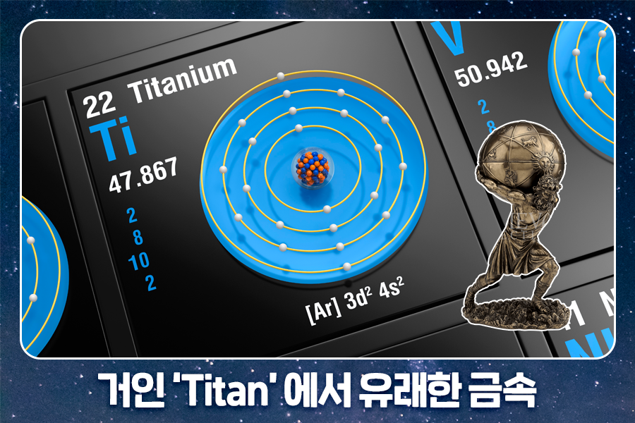 티타늄(Titanium)은 원자번호 22번, 원자량 47.867u*를 가지는 금속 물질입니다. 티타늄은 그리스 신화에 나오는 거인 티탄(Titan)에서 유래했는데요. 일반적으로 미디어 등에서 접하는 이미지처럼 단단하고 희귀하며 값비싼 금속인 티타늄과 퍽 어울리는 유래입니다.