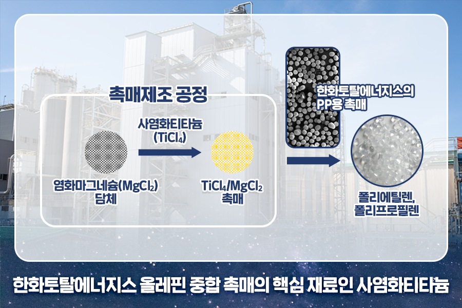 티타늄 광석을 염소(Cl2)로 녹여서 만들어지는 사염화티타늄(TiCl4)은 특히 한화토탈에너지스에 꼭 필요한 원소인데요. 기초 석유화학 제품인 폴리에틸렌과 폴리프로필렌을 만들기 위한 올레핀 중합 촉매의 가장 중요한 원료입니다.