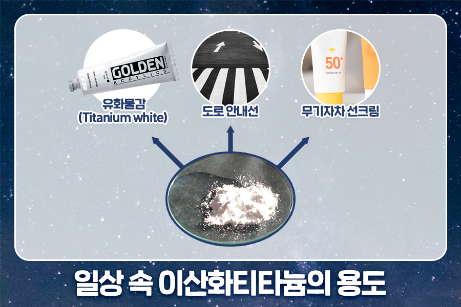 티타늄은 금속 외에도 다양하게 사용됩니다. 그 중 우리의 실생활에 밀접한 것은 바로 ‘이산화티타늄’ 입니다. 이산화티타늄은 깨끗하고 밝은 흰색의 물질로 장시간이 지나도 변질되지 않습니다. 백색 페인트, 물감, 잉크 등 안료로 많이 사용되죠. 유화 물감 중에서는 ‘Titanium white’ 라는 색상이 있을 정도로 유명합니다. 또한 도로 위의 흰색 정지선과 안내선도 이산화티타늄이 함유된 페인트로 그려집니다.