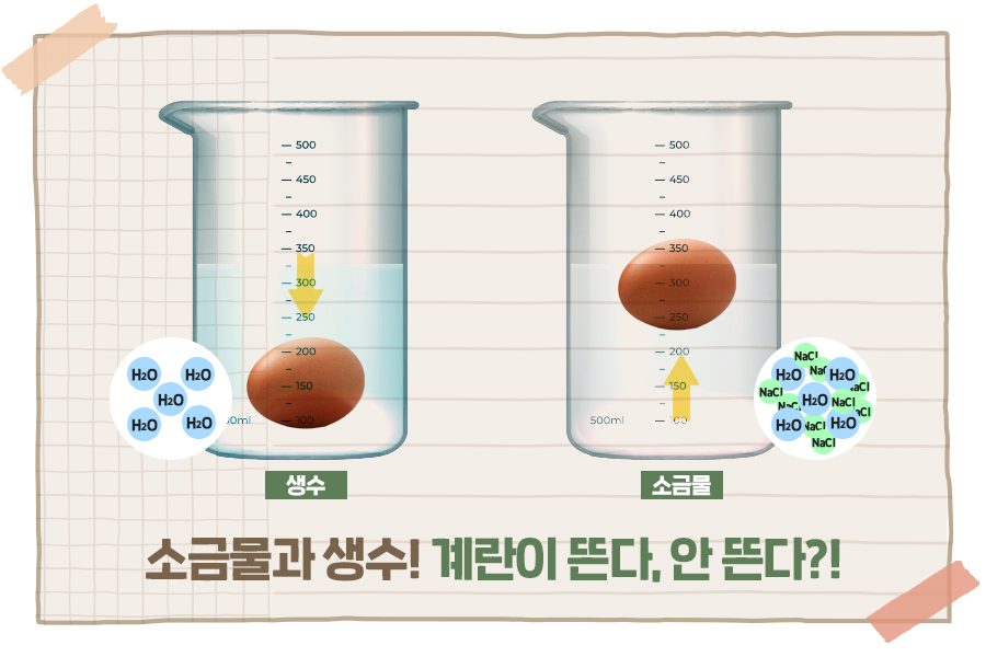 밀도는 질량을 부피로 나눈 값으로 단위 부피당 질량이라고 할 수 있습니다. 같은 부피의 철과 솜이 있다면, 철은 밀도가 높아 무겁고, 솜은 밀도가 낮아 가볍죠. 계란의 경우 물의 밀도보다 무거워 물 아래로 가라앉는 것입니다. 다만, 물에 소금을 많이 타게 되면 물 분자 사이사이가 소금으로 채워져 용액의 밀도가 높아지게 되고 결과적으로 계란을 들어 올릴 수 있게 됩니다.