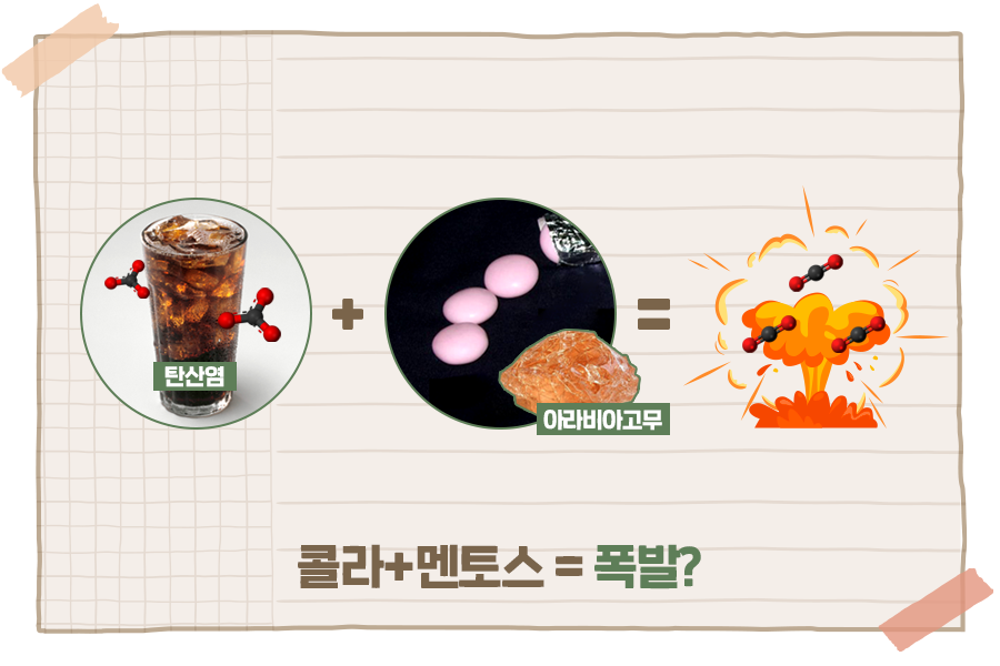 ‘핵화현상’이란 서로 다른 물질이 만나서 화학반응을 일으켜 폭발하는 현상입니다. 폭발이라니… 이거 집에서 하기 안전한 실험 맞나요? 우리가 준비할 것은 단지 콜라와 멘토스 뿐! 콜라에 멘토스를 넣으면 ‘핵화현상’을 직접 체험할 수 있습니다.
